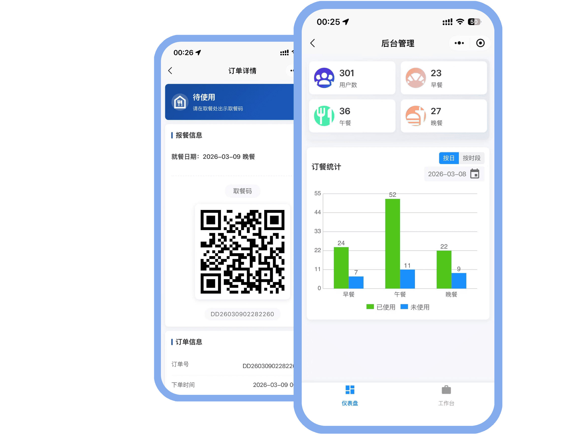 报餐小程序首页员工可选择日期、餐型、每餐食堂供应的菜品,截止预定时间等,预定成功后个人中心显示核销二维码